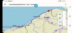 Wir sind am Ziel angekommen. Dünkirchen ist erreicht. Die „Kustenlaan“ war unsere Route wobei die Bezeichnung etwas irritierend an. Sie führt nämlich grö§tenteils nicht ander Küste laan. Die belgische Küste ist 67 KM lang, gefühlt ist alles Promenade. In den großen Orten wie Knokke oder Ostende kilometerlange mehrstöckige Häuserreihen, die große Schatten auf die Promenade werfen. Sehr voll. Im Trend scheinen hier Mehrprrsonen Gokarts zu sein. ALLE 100 Meter ein Vermieter.  Die Strände sind schön und sehr breit, abseits der Hotspots auch leer. Die Strecke ließ sichgut fahren,wir haben bestes Radwetter. Bis auf die Naturgewalt Wind. Wir fahren nach Westen, der Wind kommt aus Westen. Morgen kommt er diesbezüglich unsere Zeit. Dazu später mehr. Dünkirchen haben wir 3 Stunden verspätet erreicht. Morgens haben wir Jochens Kettenschutz dran montieren lassen, das war die erste Stunde. Klar hätten wirdasauch selbst gekonnt, aber mit viel Schmutz auf der Hand und Rückenproblemen bei der Liegendmontage. Kurz vor der Grenze musste ich meinen Akku wechseln. Im Glauben, ich hätte den Zweitakku geladen. Hatte ich aber nicht. Also im nächsten Ort ein Café gesucht, um Strom zu tanken. Während ich was Schönes suchte,sprang Jochens Kette ab. Da war klar,  irgendwo gibt es einen Schaden am Rad. Einegute Werkstatt erwischt, das Problem geschildert. Sie haben das Rad hochgehängt und dasah ich das ein Kettenglied schräg war. Ein Kettenproblem war auch die Vermutung des Monteurs. Also neue Kette, alles ist gut.